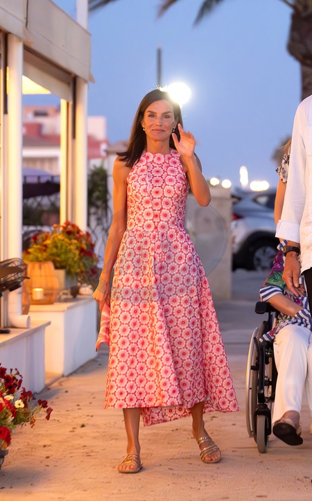 La reine Letizia d'Espagne - Les membres de la famille royale d'Espagne arrivent au restaurant Mia pour dîner pendant leurs vacances d'été à Majorque le 4 août 2024. © Lalo Yasky / Bestimage King Felipe VI , Queen Letizia, Crown Princess Leonor, Princess Sofia, Princess Irene of Greece, Emerit Queen Sofia, Jean Henri Fruchaud, Tatiana Radziwill - Spanish Royals arrive at the Mia Restaurant for dinner during their summer holidays in Mallorca. Palma de Mallorca - August 4, 2024