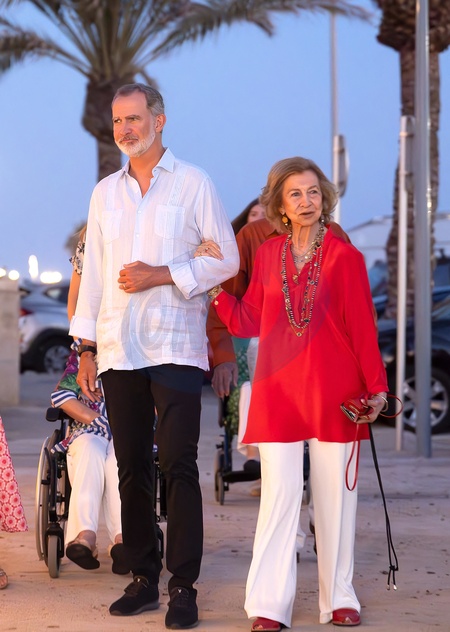 le roi Felipe VI d'Espagne, la reine Sofia - Les membres de la famille royale d'Espagne arrivent au restaurant Mia pour dîner pendant leurs vacances d'été à Majorque le 4 août 2024. © Lalo Yasky / Bestimage King Felipe VI , Queen Letizia, Crown Princess Leonor, Princess Sofia, Princess Irene of Greece, Emerit Queen Sofia, Jean Henri Fruchaud, Tatiana Radziwill - Spanish Royals arrive at the Mia Restaurant for dinner during their summer holidays in Mallorca. Palma de Mallorca - August 4, 2024