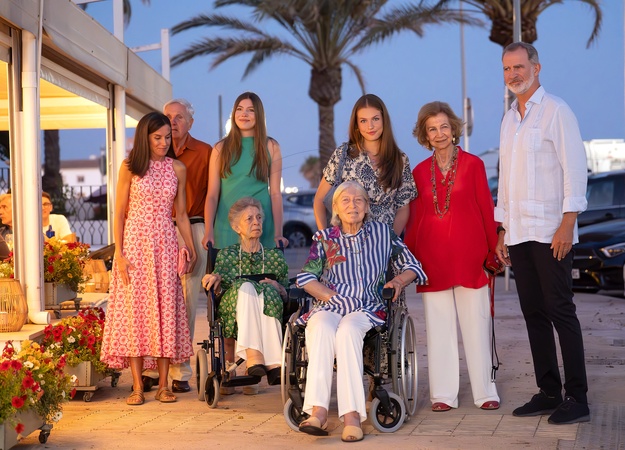 La reine Letizia, l'infante Sofia, la princesse Leonor, la reine Sofia, le roi Felipe VI d'Espagne - Les membres de la famille royale d'Espagne arrivent au restaurant Mia pour dîner pendant leurs vacances d'été à Majorque le 4 août 2024. © Lalo Yasky / Bestimage King Felipe VI , Queen Letizia, Crown Princess Leonor, Princess Sofia, Princess Irene of Greece, Emerit Queen Sofia, Jean Henri Fruchaud, Tatiana Radziwill - Spanish Royals arrive at the Mia Restaurant for dinner during their summer holidays in Mallorca. Palma de Mallorca - August 4, 2024