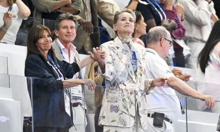 Anne Hidalgo, Sebastian Coe et Sharon Stone - Célébrités assistent à la finale homme du 100m au Stade de France lors des Jeux Olympiques de Paris2024 (JO) le 4 aout 2024. © Perusseau-Jacovides/Bestimage Celebrities attend the men's 100m final at Stade de France during the Paris2024 Olympic Games (Olympics) on August 4, 2024.