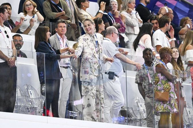 Anne Hidalgo, Sebastian Coe et Sharon Stone - Célébrités assistent à la finale homme du 100m au Stade de France lors des Jeux Olympiques de Paris2024 (JO) le 4 aout 2024. © Perusseau-Jacovides/Bestimage Celebrities attend the men's 100m final at Stade de France during the Paris2024 Olympic Games (Olympics) on August 4, 2024.