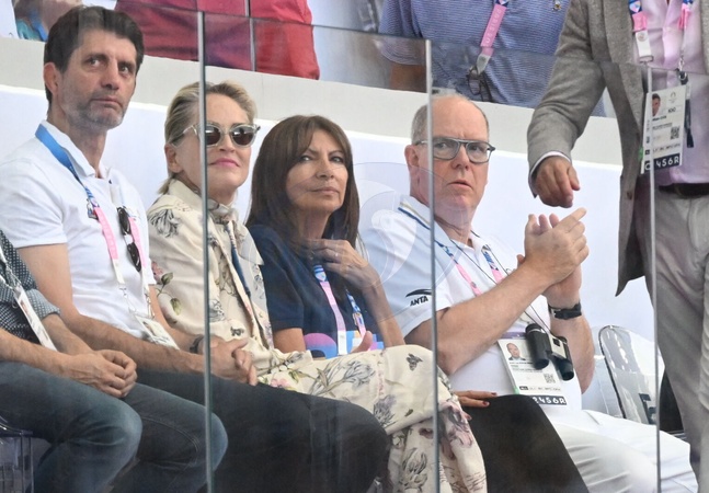 Sharon Stone, Anne Hidalgo, Le prince Albert II de Monaco - Célébrités assistent à la finale homme du 100m au Stade de France lors des Jeux Olympiques de Paris2024 (JO) le 4 aout 2024. © Perusseau-Jacovides/Bestimage Celebrities attend the men's 100m final at Stade de France during the Paris2024 Olympic Games (Olympics) on August 4, 2024.