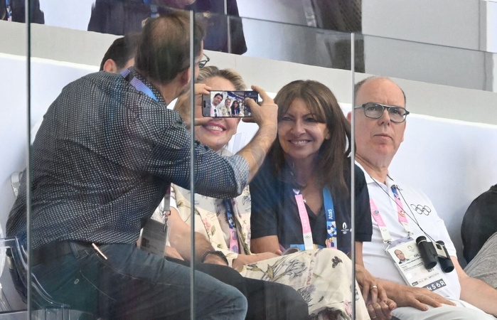 Sharon Stone, Anne Hidalgo, Le prince Albert II de Monaco - Célébrités assistent à la finale homme du 100m au Stade de France lors des Jeux Olympiques de Paris2024 (JO) le 4 aout 2024. © Perusseau-Jacovides/Bestimage Celebrities attend the men's 100m final at Stade de France during the Paris2024 Olympic Games (Olympics) on August 4, 2024.