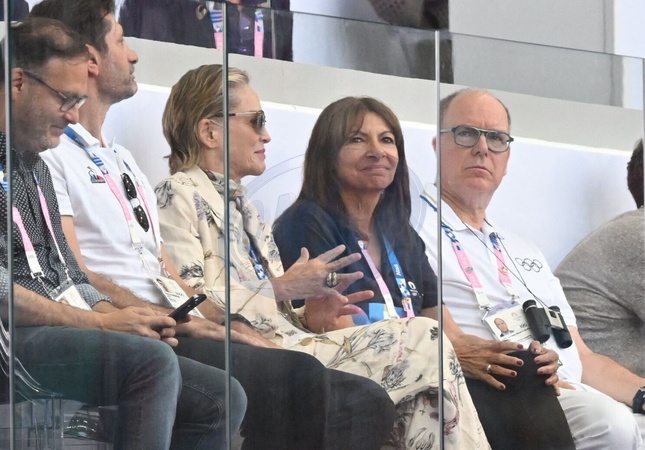 Sharon Stone, Anne Hidalgo, Le prince Albert II de Monaco - Célébrités assistent à la finale homme du 100m au Stade de France lors des Jeux Olympiques de Paris2024 (JO) le 4 aout 2024. © Perusseau-Jacovides/Bestimage Celebrities attend the men's 100m final at Stade de France during the Paris2024 Olympic Games (Olympics) on August 4, 2024.