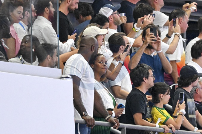 Célébrités assistent à la finale homme du 100 m au Stade de France lors des Jeux Olympiques de Paris2024 (JO)