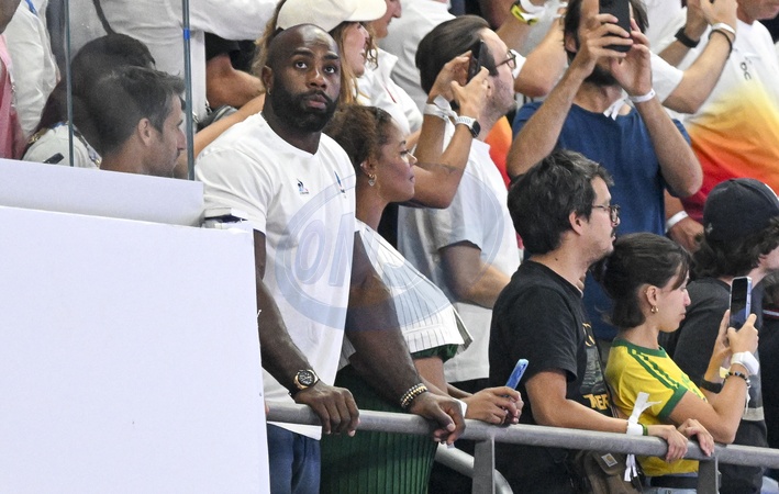 Teddy Riner et sa femme - Célébrités assistent à la finale homme du 100m au Stade de France lors des Jeux Olympiques de Paris2024 (JO) le 4 aout 2024. © Perusseau-Jacovides/Bestimage Celebrities attend the men's 100m final at Stade de France during the Paris2024 Olympic Games (Olympics) on August 4, 2024.