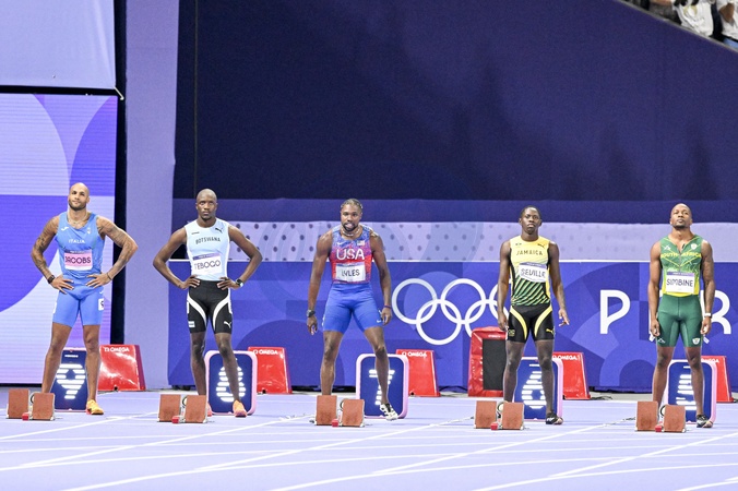 Jacobs, Tebogo, Noah Lyles, Seville, Simbine - Célébrités assistent à la finale homme du 100m au Stade de France lors des Jeux Olympiques de Paris2024 (JO) le 4 aout 2024. © Perusseau-Jacovides/Bestimage Celebrities attend the men's 100m final at Stade de France during the Paris2024 Olympic Games (Olympics) on August 4, 2024.