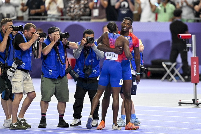 Gwiazdy na finale biegu na 100 m mężczyzn na Stade de France podczas Igrzysk Olimpijskich w Paryżu w 2024 r.
