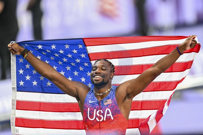 Noah Lyles - Célébrités assistent à la finale homme du 100m au Stade de France lors des Jeux Olympiques de Paris2024 (JO) le 4 aout 2024. © Perusseau-Jacovides/Bestimage Celebrities attend the men's 100m final at Stade de France during the Paris2024 Olympic Games (Olympics) on August 4, 2024.