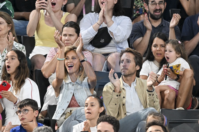 Ophélie Meunier et son mari Mathieu Vergne - Les célébrités assistent aux épreuves de gymnastique lors des Jeux Olympiques de Paris2024 (JO), le 5 août 2024. © Jacovides-Perusseau / Bestimage Celebrities attend the gymnastics events during the Paris 2024 Summer Olympics (Olympic Games) on August 5, 2024.