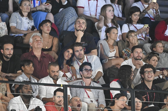 Jesse Williams, Chase Stokes, Paul Wesley et sa compagne Natalie Kuckenburg - Les célébrités assistent aux épreuves de gymnastique lors des Jeux Olympiques de Paris2024 (JO), le 5 août 2024. © Jacovides-Perusseau / Bestimage Celebrities attend the gymnastics events during the Paris 2024 Summer Olympics (Olympic Games) on August 5, 2024.