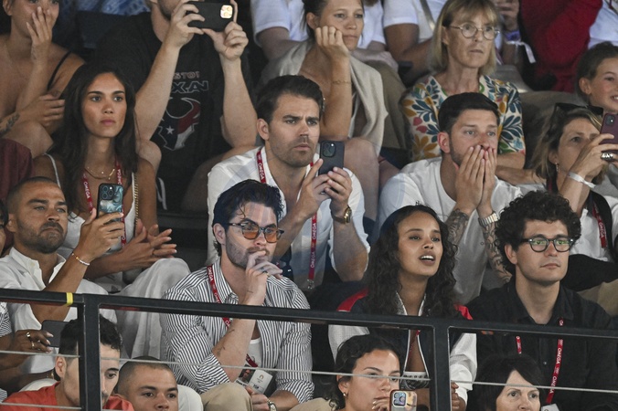Jesse Williams, Chase Stokes, Paul Wesley et sa compagne Natalie Kuckenburg - Les célébrités assistent aux épreuves de gymnastique lors des Jeux Olympiques de Paris2024 (JO), le 5 août 2024. © Jacovides-Perusseau / Bestimage Celebrities attend the gymnastics events during the Paris 2024 Summer Olympics (Olympic Games) on August 5, 2024.