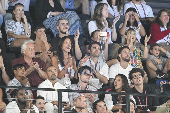 Jesse Williams, Chase Stokes, Paul Wesley et sa compagne Natalie Kuckenburg - Les célébrités assistent aux épreuves de gymnastique lors des Jeux Olympiques de Paris2024 (JO), le 5 août 2024. © Jacovides-Perusseau / Bestimage Celebrities attend the gymnastics events during the Paris 2024 Summer Olympics (Olympic Games) on August 5, 2024.