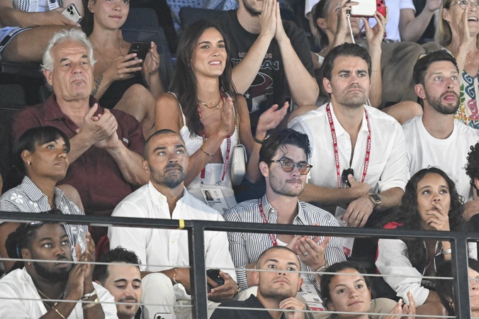 Jesse Williams, Chase Stokes, Paul Wesley et sa compagne Natalie Kuckenburg - Les célébrités assistent aux épreuves de gymnastique lors des Jeux Olympiques de Paris2024 (JO), le 5 août 2024. © Jacovides-Perusseau / Bestimage Celebrities attend the gymnastics events during the Paris 2024 Summer Olympics (Olympic Games) on August 5, 2024.