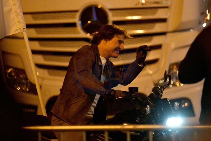 Exclusif - Prix Spécial - No Web - Tom Cruise tourne une scène en moto pour le film "Mission : Impossible 8" dans les rues de Paris