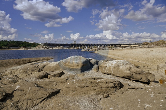 ZAPORIZHZHIA, UKRAINE - JULY 31, 2024 - Rocks are seen in the Dnipro River near the Dnipro Hydroelectric Power Station, also known as the DniproHES, as the water level dropped after Russian invaders set off the Kakhovka Dam on 6 June 2023, Zaporizhzhia, southeastern Ukraine., Credit:Dmytro Smolienko / Avalon