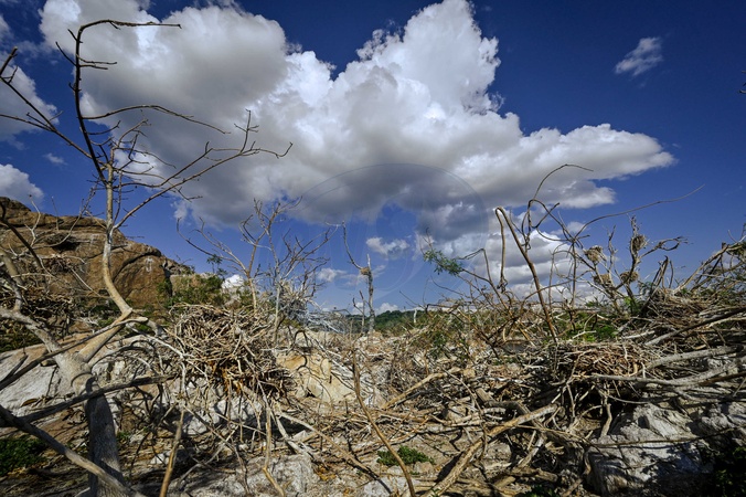 ZAPORIZHZHIA, UKRAINE - JULY 31, 2024 - Clouds are seen over dry plants as the water level in the Dnipro River dropped after Russian invaders set off the Kakhovka Dam on 6 June 2023, Zaporizhzhia, southeastern Ukraine., Credit:Dmytro Smolienko / Avalon