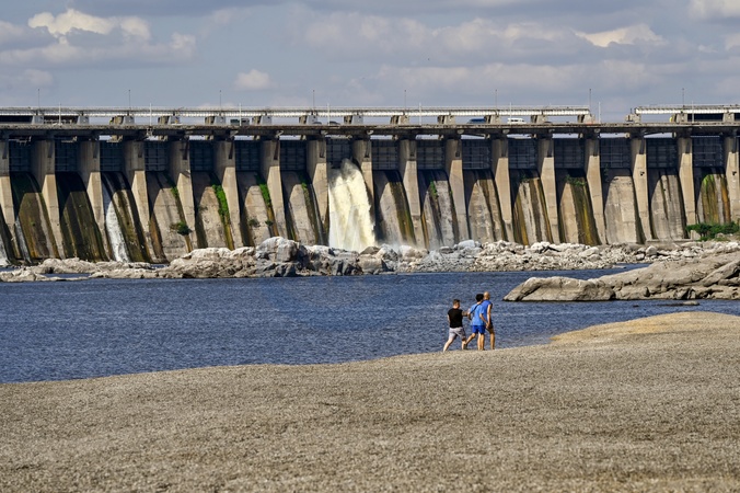 ZAPORIZHZHIA, UKRAINE - JULY 31, 2024 - People explore the land in front of the dam of the Dnipro Hydroelectric Power Station, also known as the DniproHES, which emerged from the Dnipro River as the water level _drop_ped after Russian invaders set off the Kakhovka Dam on 6 June 2023, Zaporizhzhia, southeastern Ukraine., Credit:Dmytro Smolienko / Avalon