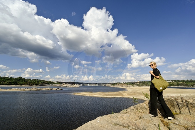 ZAPORIZHZHIA, UKRAINE - JULY 31, 2024 - A woman stands on the bank of the Dnipro River as the water level dropped after Russian invaders set off the Kakhovka Dam on 6 June 2023, Zaporizhzhia, southeastern Ukraine., Credit:Dmytro Smolienko / Avalon