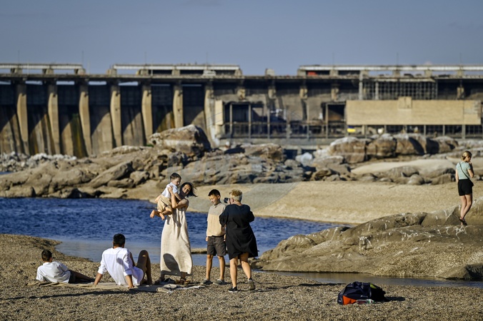 ZAPORIZHZHIA, UKRAINE - JULY 31, 2024 - People explore the land in front of the dam of the Dnipro Hydroelectric Power Station, also known as the DniproHES, which has emerged from the Dnipro River as the water level dropped after Russian invaders set off the Kakhovka Dam on 6 June 2023, Zaporizhzhia, southeastern Ukraine., Credit:Dmytro Smolienko / Avalon