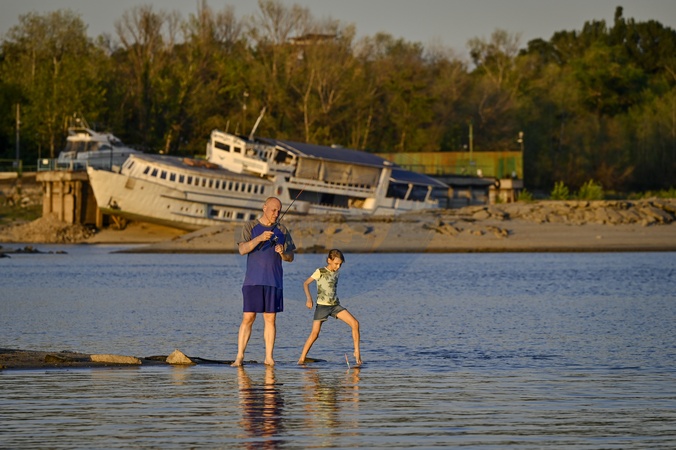 ZAPORIZHZHIA, UKRAINE - JULY 31, 2024 - A man and boy stand ankle-deep in water on the bank of the Dnipro River as the water level dropped after Russian invaders set off the Kakhovka Dam on 6 June 2023, Zaporizhzhia, southeastern Ukraine., Credit:Dmytro Smolienko / Avalon