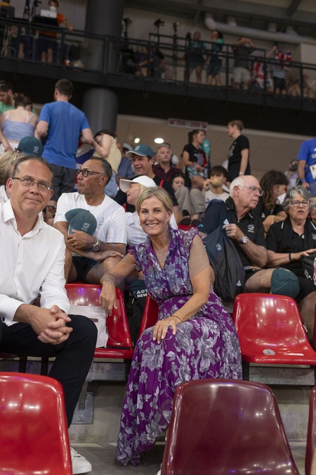 Księżna Sophie z Edynburga patrzy, jak Brytyjki wygrywają finał sprintu drużynowego kobiet w kolarstwie lekkoatletycznym podczas Igrzysk Olimpijskich 2024 w Paryżu (OG) na torze Vélodrome National w Saint-Quentin-en-Yvelines