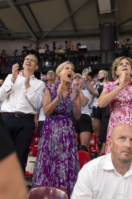 Księżna Sophie z Edynburga patrzy, jak Brytyjki wygrywają finał sprintu drużynowego kobiet w kolarstwie lekkoatletycznym podczas Igrzysk Olimpijskich 2024 w Paryżu (OG) na torze Vélodrome National w Saint-Quentin-en-Yvelines