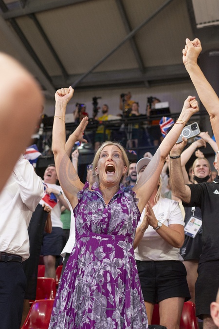 Księżna Sophie z Edynburga patrzy, jak Brytyjki wygrywają finał sprintu drużynowego kobiet w kolarstwie lekkoatletycznym podczas Igrzysk Olimpijskich 2024 w Paryżu (OG) na torze Vélodrome National w Saint-Quentin-en-Yvelines