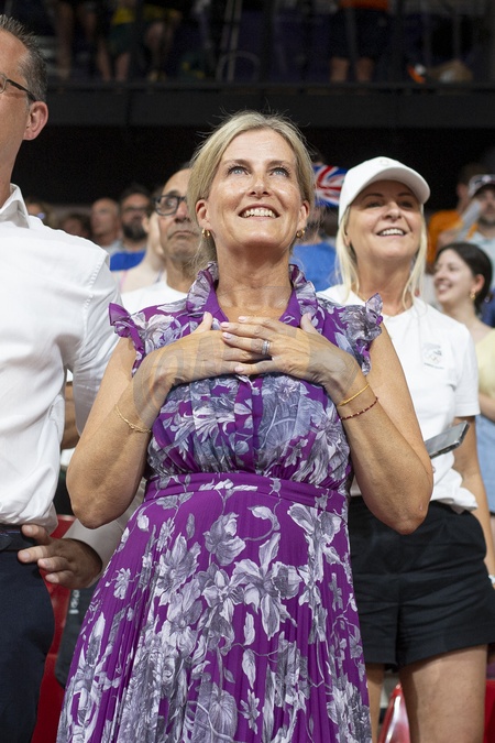 Księżna Sophie z Edynburga patrzy, jak Brytyjki wygrywają finał sprintu drużynowego kobiet w kolarstwie lekkoatletycznym podczas Igrzysk Olimpijskich 2024 w Paryżu (OG) na torze Vélodrome National w Saint-Quentin-en-Yvelines