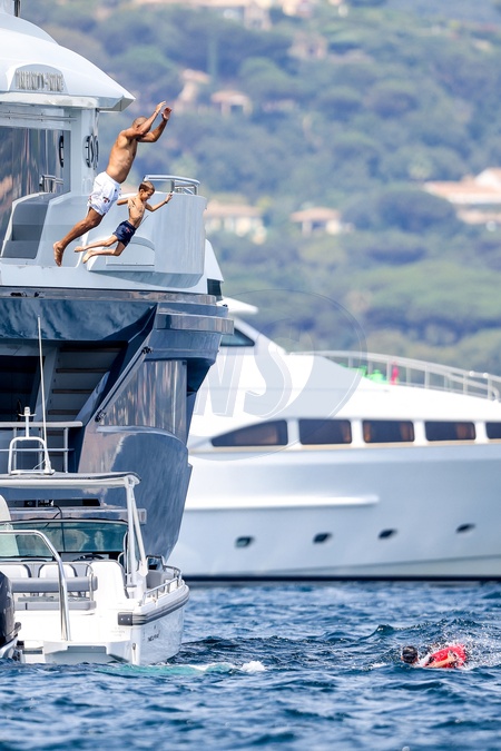 Exclusif - Prix Spécial - No Crédit - BI - No Web - L'ancien meneur français des Spurs de San AntonioTony Parker avec sa compagne Agathe Teyssier et ses enfants Liam et Josh en vacances sur son yacht Infinity Nine (à 9M€) dans le golfe de Saint-Tropez, Côte d'Azur, France, le 5 août 2024. Au programme: Saut dans la mer du ponton supérieur, scooters de mer, Seabobs, bouée tractée pour bateau, bronzage et câlins.... Exclusive - For Germany Call For Prize - No Credit - No Web - Former French leader for the San Antonio Spurs Tony Parker with his partner Agathe Teyssier and his children Liam and Josh on vacation on his yacht Infinity Nine (€9M) in the Gulf of Saint-Tropez, French Riviera, France, August 5, 2024. On the program: Jumping into the sea from the upper pontoon, sea scooters, Seabobs, towed buoy for boat, sunbathing and cuddles....