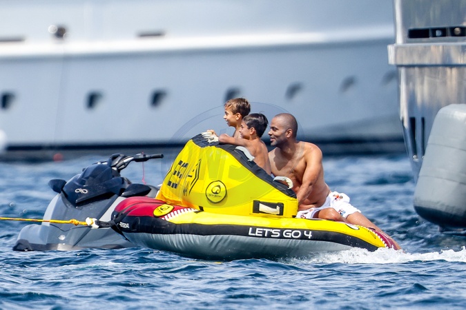 Exclusif - Prix Spécial - No Crédit - BI - No Web - L'ancien meneur français des Spurs de San AntonioTony Parker avec sa compagne Agathe Teyssier et ses enfants Liam et Josh en vacances sur son yacht Infinity Nine (à 9M€) dans le golfe de Saint-Tropez, Côte d'Azur, France, le 5 août 2024. Au programme: Saut dans la mer du ponton supérieur, scooters de mer, Seabobs, bouée tractée pour bateau, bronzage et câlins.... Exclusive - For Germany Call For Prize - No Credit - No Web - Former French leader for the San Antonio Spurs Tony Parker with his partner Agathe Teyssier and his children Liam and Josh on vacation on his yacht Infinity Nine (€9M) in the Gulf of Saint-Tropez, French Riviera, France, August 5, 2024. On the program: Jumping into the sea from the upper pontoon, sea scooters, Seabobs, towed buoy for boat, sunbathing and cuddles....