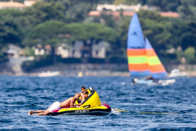 Exclusif - Prix Spécial - No Crédit - BI - No Web - L'ancien meneur français des Spurs de San AntonioTony Parker avec sa compagne Agathe Teyssier et ses enfants Liam et Josh en vacances sur son yacht Infinity Nine (à 9M€) dans le golfe de Saint-Tropez, Côte d'Azur, France, le 5 août 2024. Au programme: Saut dans la mer du ponton supérieur, scooters de mer, Seabobs, bouée tractée pour bateau, bronzage et câlins.... Exclusive - For Germany Call For Prize - No Credit - No Web - Former French leader for the San Antonio Spurs Tony Parker with his partner Agathe Teyssier and his children Liam and Josh on vacation on his yacht Infinity Nine (€9M) in the Gulf of Saint-Tropez, French Riviera, France, August 5, 2024. On the program: Jumping into the sea from the upper pontoon, sea scooters, Seabobs, towed buoy for boat, sunbathing and cuddles....