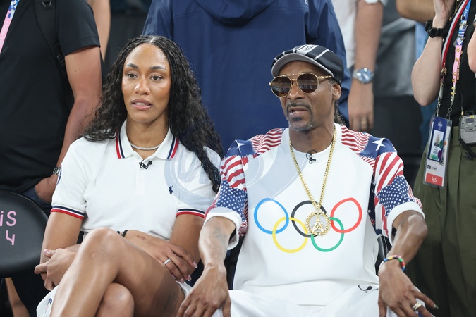 A'ja Wilson et Snoop Dogg - Les célébrités assistent à la victoire de l'équipe de France de basket face au Canada (82-73) lors des Jeux Olympiques de Paris2024, le 6 août 2024. © Jacovides-Perusseau / Bestimage Merci de flouter le visage des enfants avant parution Celebrities attend the victory of the French basketball team against Canada (82-73) during the Paris 2024 Olympic Games, on August 6, 2024.