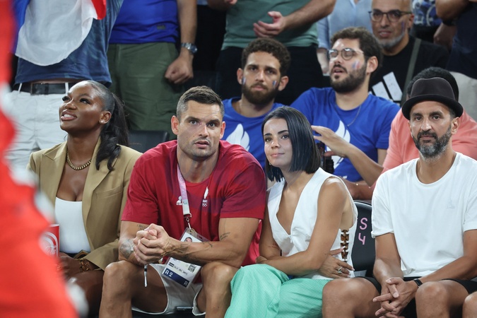 Florent Manaudou et sa compagne Lola Duménil - Les célébrités assistent à la victoire de l'équipe de France de basket face au Canada (82-73) lors des Jeux Olympiques de Paris2024, le 6 août 2024. © Jacovides-Perusseau / Bestimage Merci de flouter le visage des enfants avant parution Celebrities attend the victory of the French basketball team against Canada (82-73) during the Paris 2024 Olympic Games, on August 6, 2024.