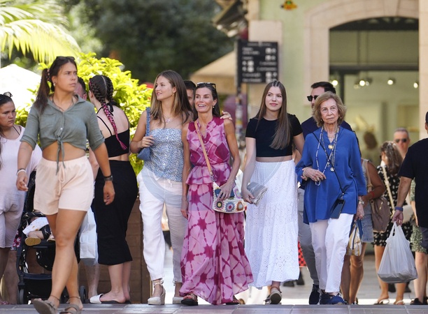 Królowa Hiszpanii Letizia, jej córki, księżniczka Leonor i infantka Sofia, królowa Sofia, spacerują po Palma de Mallorca