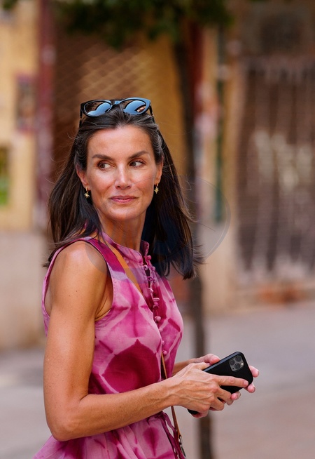 La reine Letizia d'Espagne lors d'une sortie à Palma de Majorque le 6 août 2024. Queen Letizia, Crownprincess Leonor, Princess Sofia and Emerit Queen Sofia strolling in Palma de Mallorca during their summer holidays in the Baleric Islands. August 6, 2024