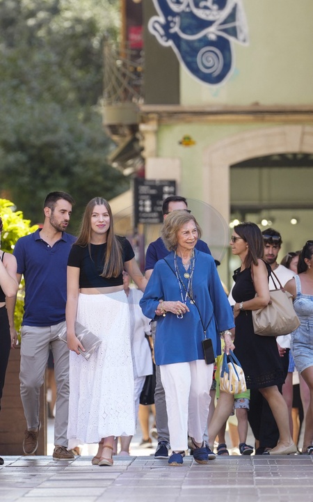 La reine Letizia d'Espagne, ses filles la princesse Leonor et l'infante Sofia, la reine Sofia, se baladent à Palma de Majorque