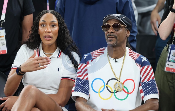 A'ja Wilson et Snoop Dogg - Les célébrités assistent à la victoire de l'équipe des USA de basket face au Brésil (122-87) lors des Jeux Olympiques de Paris2024, le 6 août 2024. © Jacovides-Perusseau / Bestimage Celebrities attend the victory of the US basketball team against Brésil (122-87) during the Paris 2024 Olympic Games, on August 6, 2024.