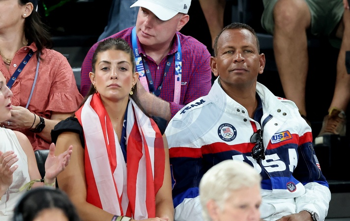 Alex Rodriguez et une amie - Les célébrités assistent à la victoire de l'équipe des USA de basket face au Brésil (122-87) lors des Jeux Olympiques de Paris2024, le 6 août 2024. © Jacovides-Perusseau / Bestimage Celebrities attend the victory of the US basketball team against Brésil (122-87) during the Paris 2024 Olympic Games, on August 6, 2024.