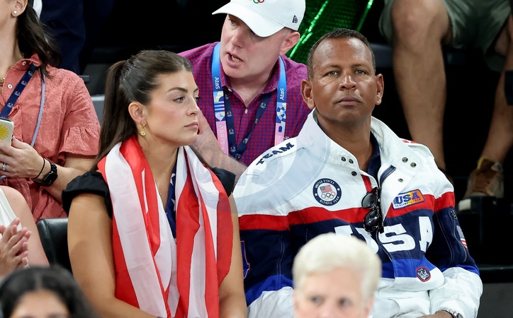Alex Rodriguez et une amie - Les célébrités assistent à la victoire de l'équipe des USA de basket face au Brésil (122-87) lors des Jeux Olympiques de Paris2024, le 6 août 2024. © Jacovides-Perusseau / Bestimage Celebrities attend the victory of the US basketball team against Brésil (122-87) during the Paris 2024 Olympic Games, on August 6, 2024.