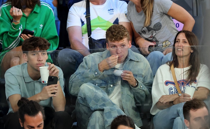 Léon Marchand et son frére Oscar - Les célébrités assistent à la victoire de l'équipe des USA de basket face au Brésil (122-87) lors des Jeux Olympiques de Paris2024, le 6 août 2024. © Jacovides-Perusseau / Bestimage Celebrities attend the victory of the US basketball team against Brésil (122-87) during the Paris 2024 Olympic Games, on August 6, 2024.