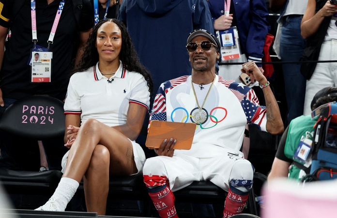 A'ja Wilson et Snoop Dogg - Les célébrités assistent à la victoire de l'équipe des USA de basket face au Brésil (122-87) lors des Jeux Olympiques de Paris2024, le 6 août 2024. © Jacovides-Perusseau / Bestimage Celebrities attend the victory of the US basketball team against Brésil (122-87) during the Paris 2024 Olympic Games, on August 6, 2024.