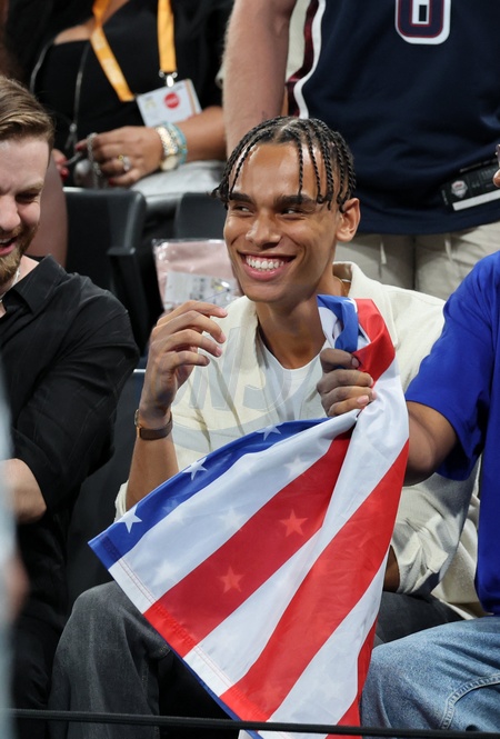 Célébrités assistent au match de basket entre les Etats-Unis et le Brésil (122-87) lors des Jeux Olympiques de Paris2024 (JO)