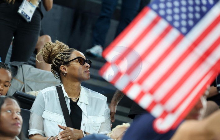 Savannah James, femme de LeBron James - Les célébrités assistent à la victoire de l'équipe des USA de basket face au Brésil (122-87) lors des Jeux Olympiques de Paris2024, le 6 août 2024. © Jacovides-Perusseau / Bestimage Celebrities attend the victory of the US basketball team against Brésil (122-87) during the Paris 2024 Olympic Games, on August 6, 2024.
