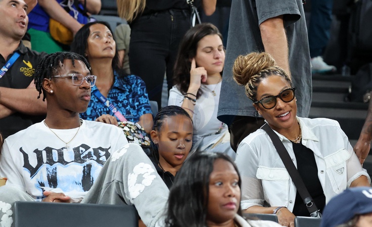 Savannah James, femme de LeBron James et ses enfants LeBron James Jr et Zhuri - Les célébrités assistent à la victoire de l'équipe des USA de basket face au Brésil (122-87) lors des Jeux Olympiques de Paris2024, le 6 août 2024. © Jacovides-Perusseau / Bestimage Celebrities attend the victory of the US basketball team against Brésil (122-87) during the Paris 2024 Olympic Games, on August 6, 2024.