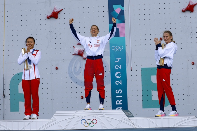 MIROSLAW Aleksandra z Polski DENG Lijuan z Chińskiej Republiki Ludowej Sport KALUCKA Aleksandra z Polski na podium Wspinaczka na czas kobiet, finał podczas Igrzysk Olimpijskich Paryż 2024 w dniu 7 sierpnia 2024 r.