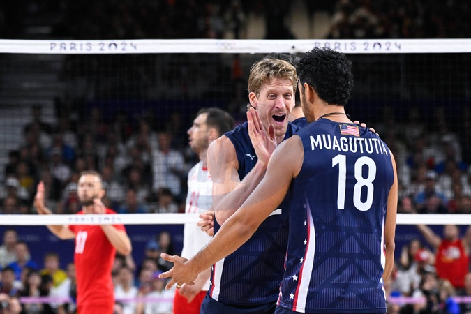 Semi finals - HOLT Maxwell ( 12 - USA ) and MUAGUTUTIA Garrett ( 18 - USA ) celebrate during the 2024 Olympics Games match between Poland and United States at Arena Paris Sud on August 07, 2024 in Paris, France. © Federico Pestellini / DPPI / Panoramic / Bestimage