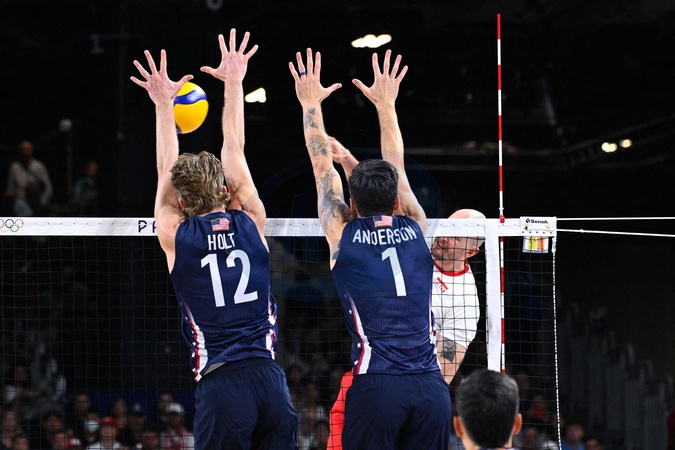 Semi finals - KUREK Bartosz ( 6 - Poland ) , HOLT Maxwell ( 12 - USA ) and ANDERSON Matthew ( 1 - USA ) during the 2024 Olympics Games match between Poland and United States at Arena Paris Sud on August 07, 2024 in Paris, France. © Federico Pestellini / DPPI / Panoramic / Bestimage
