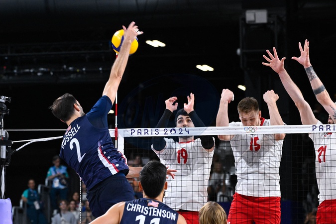 Semi finals - RUSSELL Aaron ( 2 - USA ) , JANUSZ Marcin ( 19 - Poland ) and KOCHANOWSKI Jakub ( 15 - Poland ) during the 2024 Olympics Games match between Poland and United States at Arena Paris Sud on August 07, 2024 in Paris, France. © Federico Pestellini / DPPI / Panoramic / Bestimage