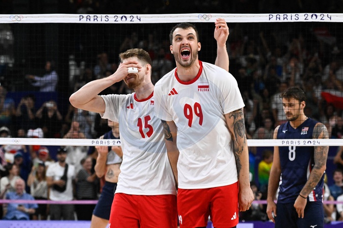 Semi finals - KOCHANOWSKI Jakub ( 15 - Poland ) and HUBER Norbert ( 99 - Poland ) celebrate their side's victory after the 2024 Olympics Games match between Poland and United States at Arena Paris Sud on August 07, 2024 in Paris, France. © Federico Pestellini / DPPI / Panoramic / Bestimage